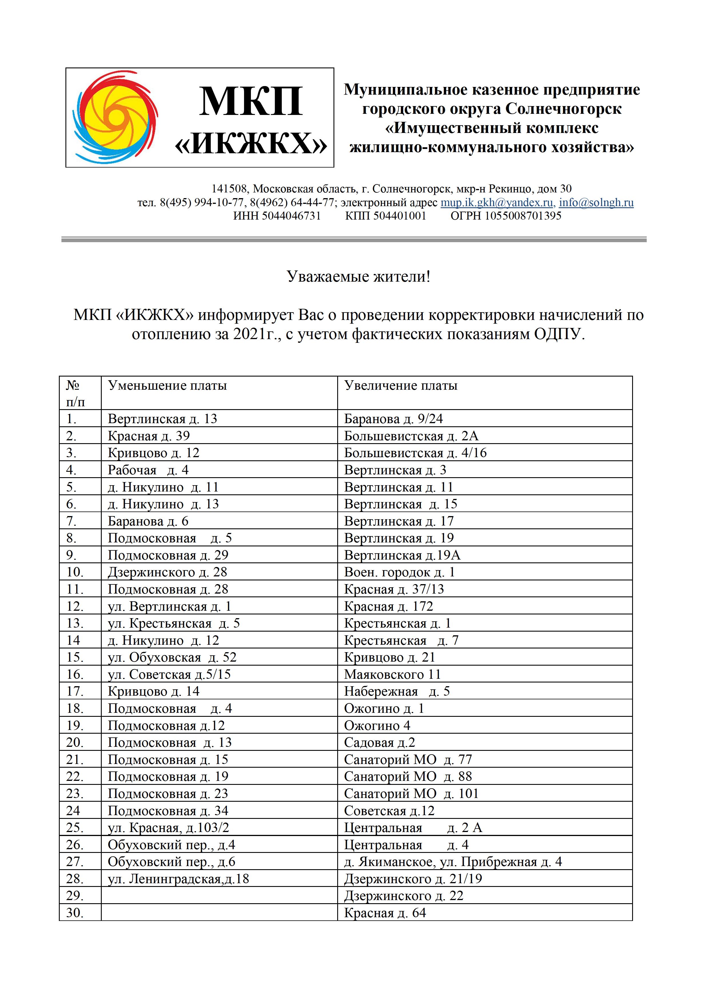 МКП «ИКЖКХ» доводит до Вашего сведения, что за сверхнормативный период проведения планово-профилактических работ в июне 2021 года, а также отсутствия отопления и ГВС, вследствие проведения аварийно-восстановительных работ на наружных сетях теплоснабжения в сентябре-ноябре 2021 года, предприятием дано поручение платежному агенту ООО «МосОблЕИРЦ» об осуществлении соответствующего перерасчета.