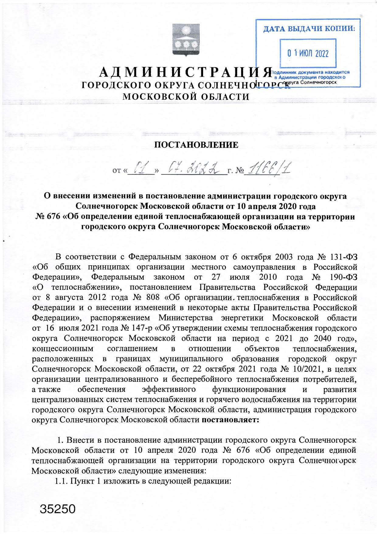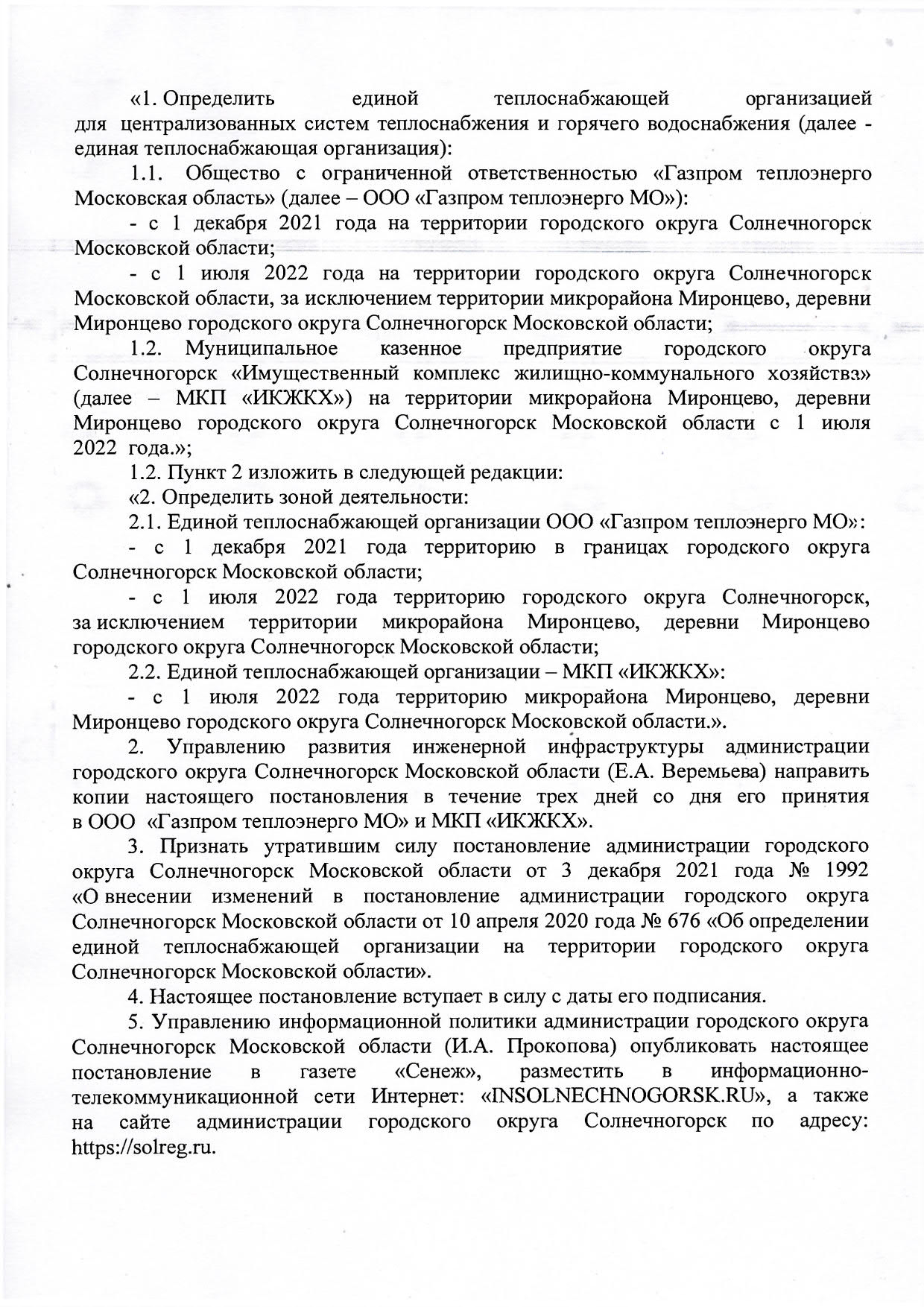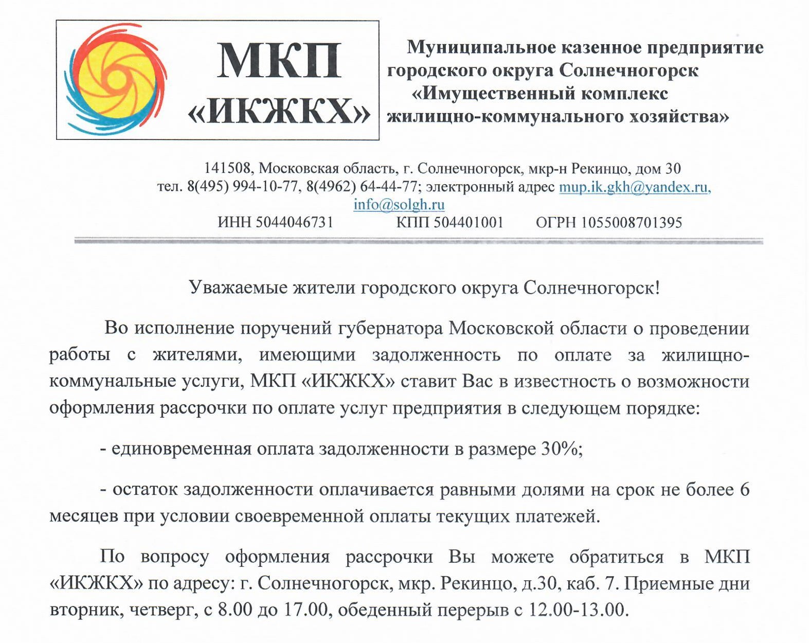 В соответствии с Постановлениями Администрации городского округа Солнечногорск Московской области от 10.04.2020 года № 676 «Об определении единой теплоснабжающей организации на территории городского округа Солнечногорск Московской области» и от 06.12.2019 года №2169 (с изм. от 04.02.2020 г. №180) «Об определении гарантирующей организации в сфере водоснабжения и водоотведения на территории городского округа Солнечногорск Московской области» муниципальное казенное предприятие городского округа Солнечногорск «Имущественный комплекс жилищно-коммунального хозяйства» (далее - МКП «ИКЖКХ») определено единой теплоснабжающей организацией и гарантирующей организации в сфере водоснабжения и водоотведения на территории городского округа Солнечногорск Московской области.
