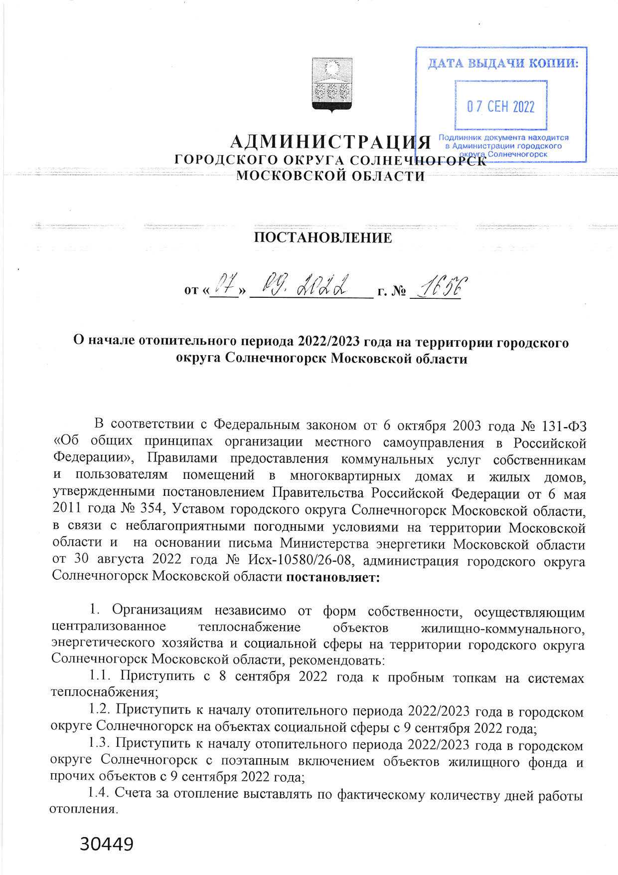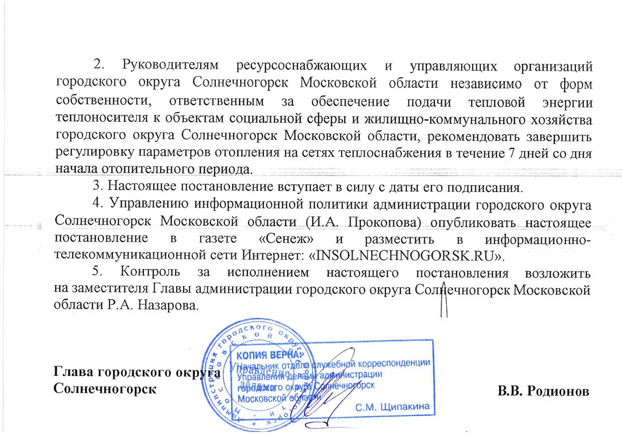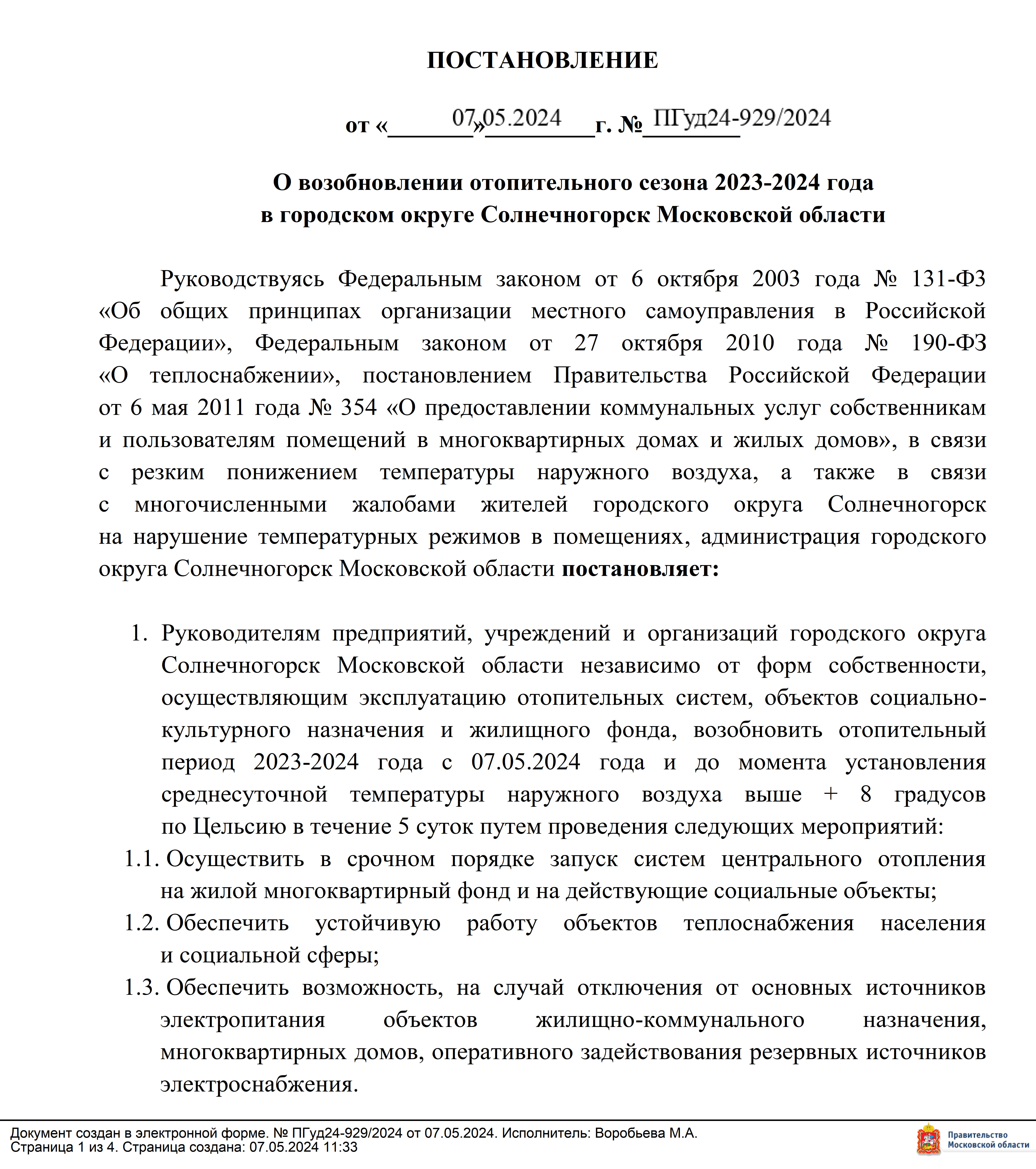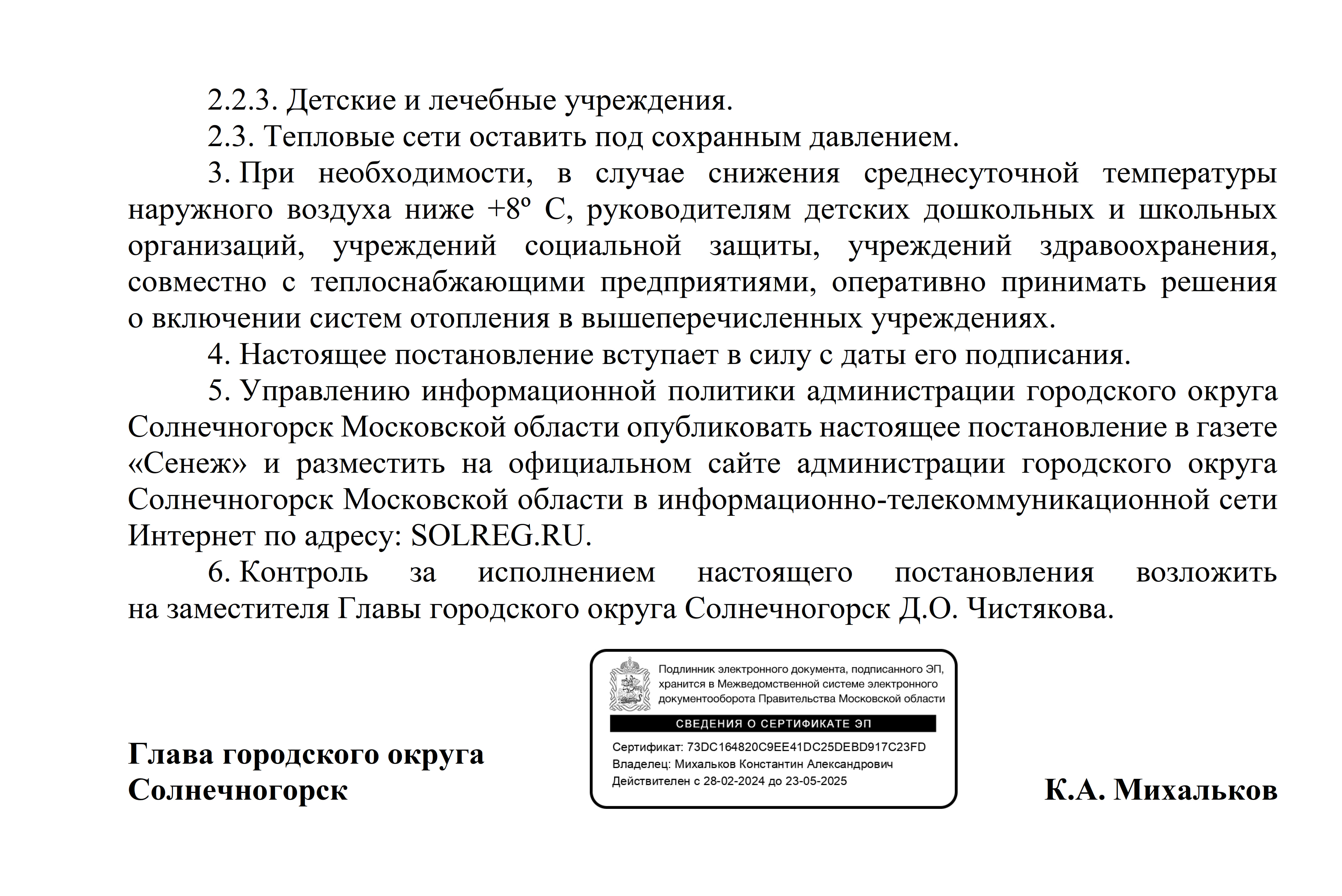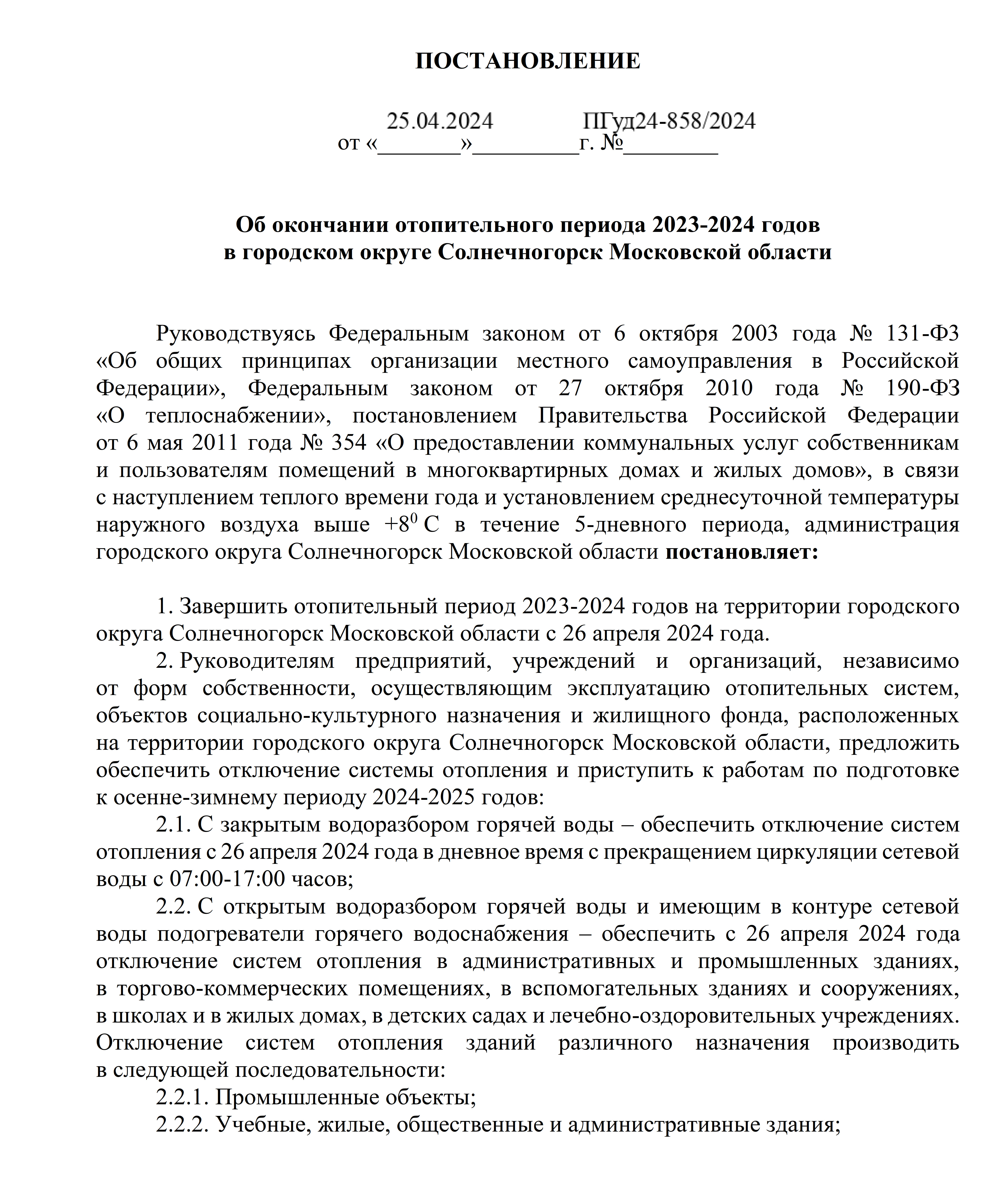 «Об окончании отопительного периода 2024-2025 годов в городском округе Солнечногорск Московской области»